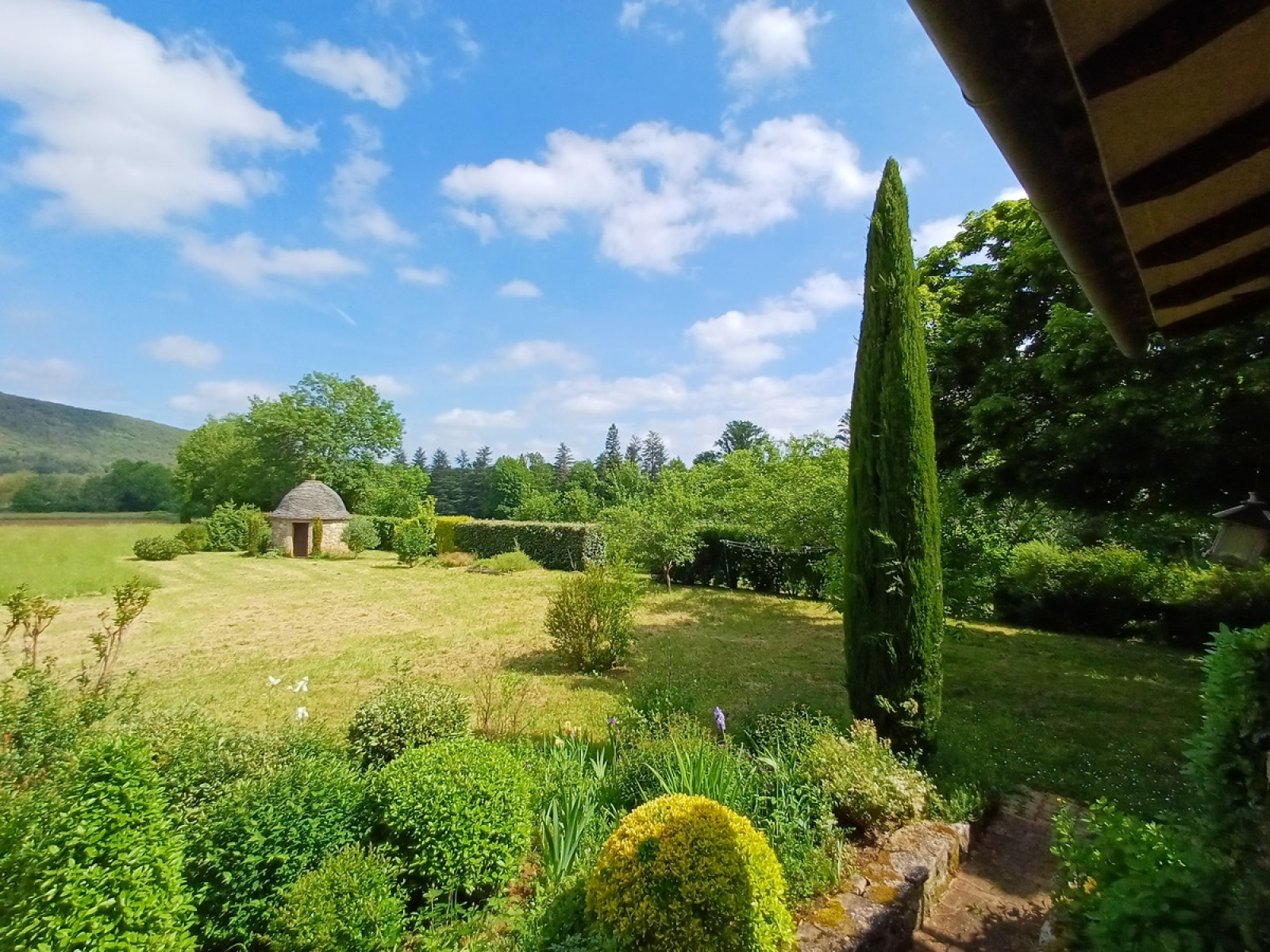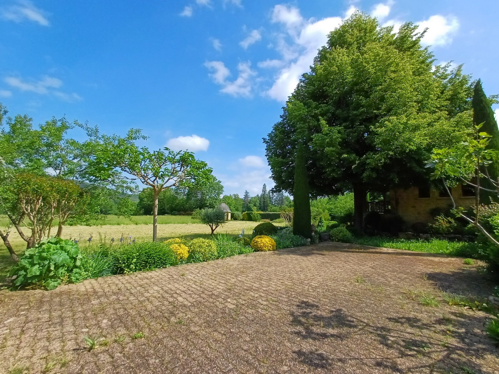 Terrain plat et arboré de 3686 m² avec cazelle en pierre sèche.
